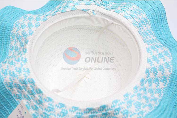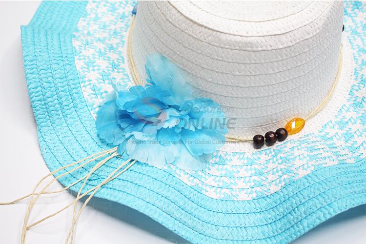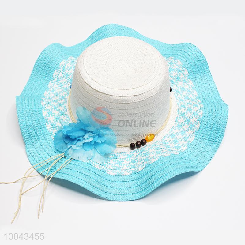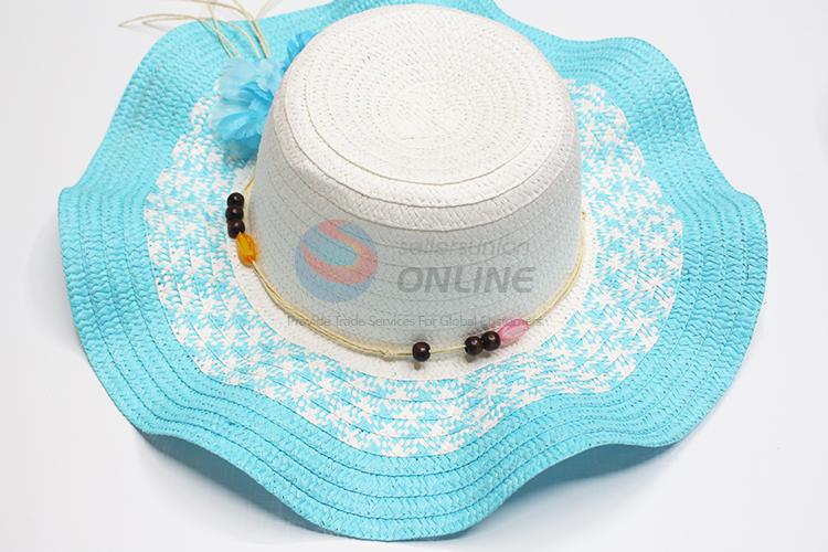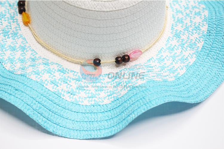 Blue big brim paper hat with wooden beads