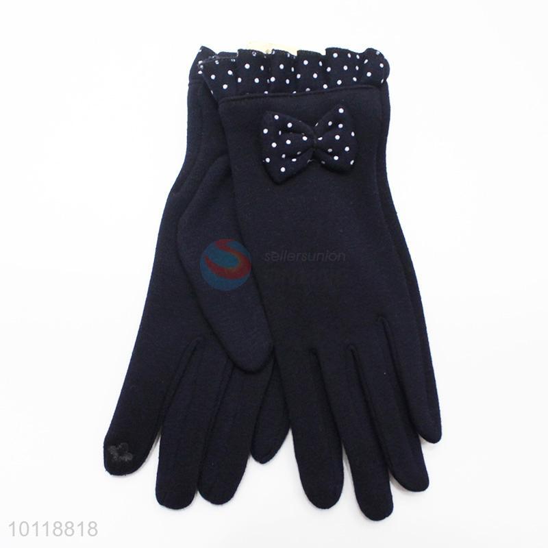 Elegant Dark Blue Dots Mirco Velvet Gloves with Bowknot