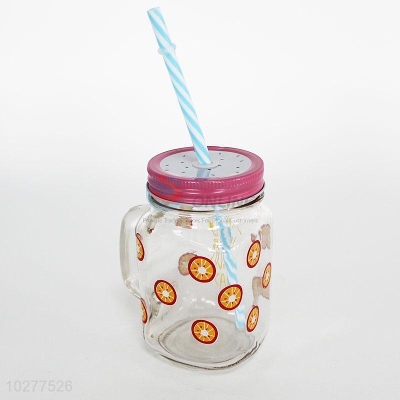 Orange pattern glass cup with straw