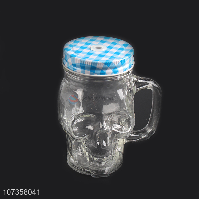 Latest style skull shape glass juice cup with straw & lid