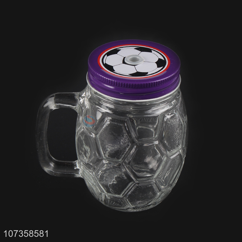 Promotional creative football shape glass juice cup with straw & lid