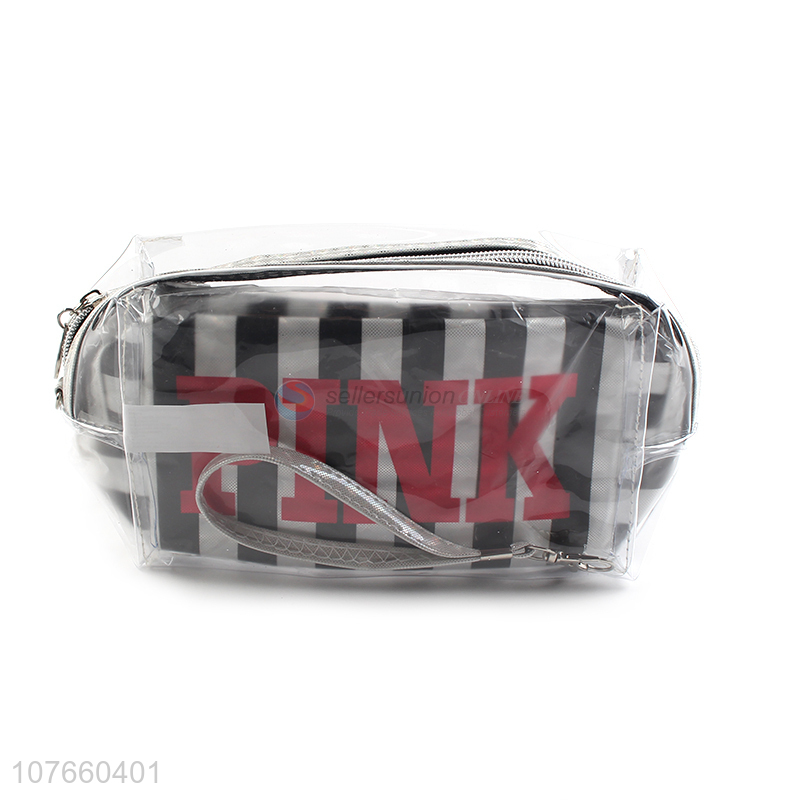Hot sale personalized black stripe cosmetic bag with frosted detachable hand strap