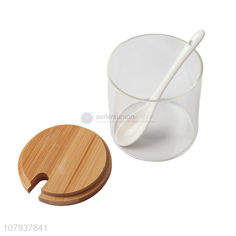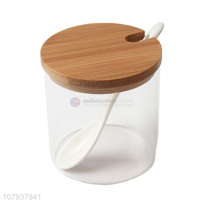 Wholesale transparent glass condiment pot spice can with spoon & bamboo lid