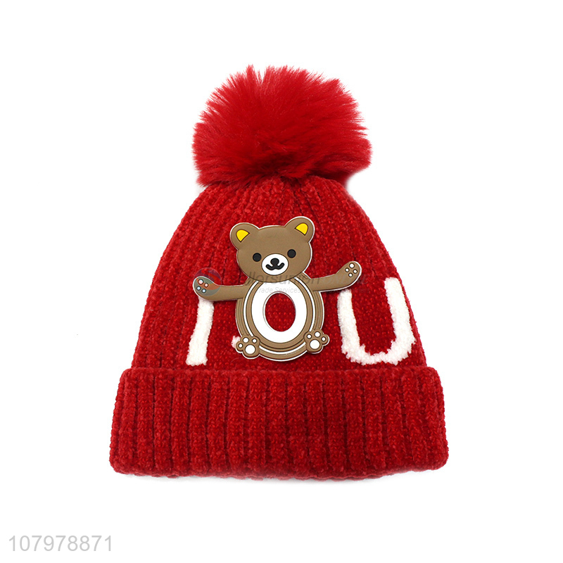 Wholesale cartoon women winter fleece lined beanie with faux fur pom pom