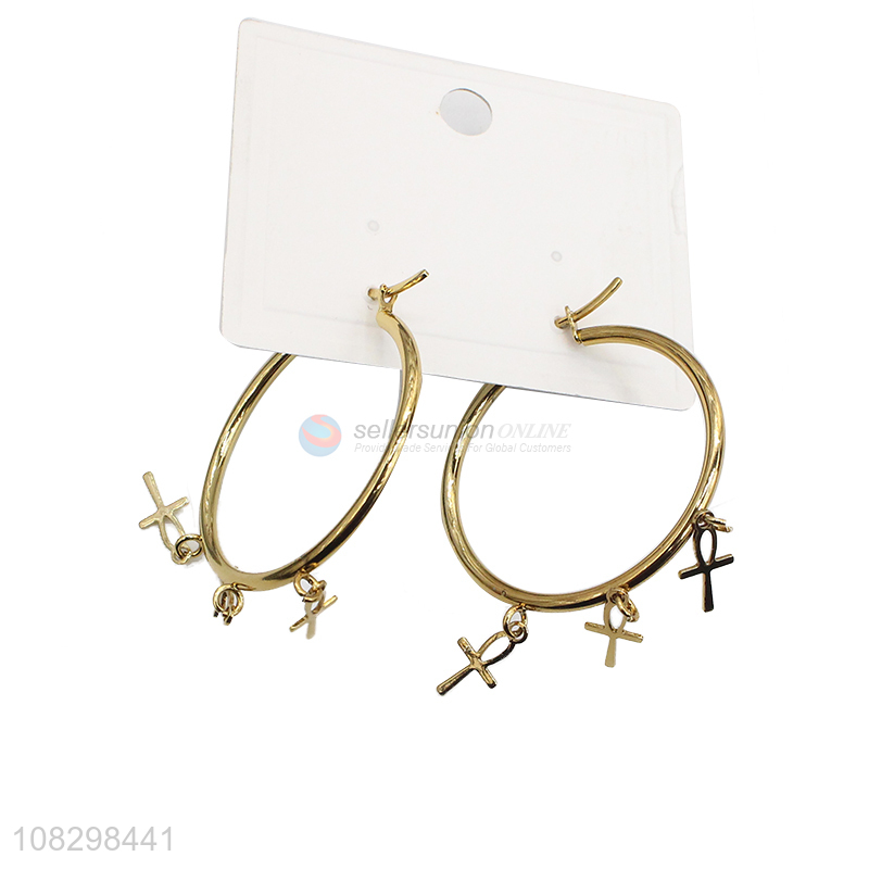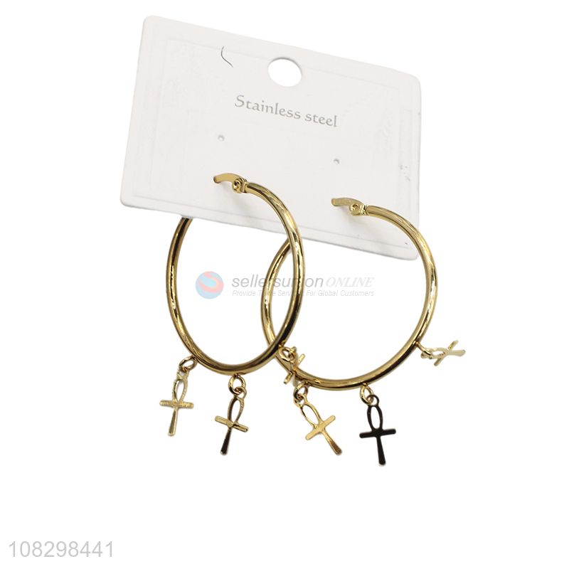 Good quality trendy stainless steel cross pendant hoop earrings