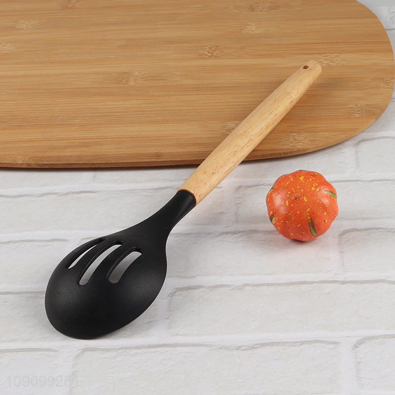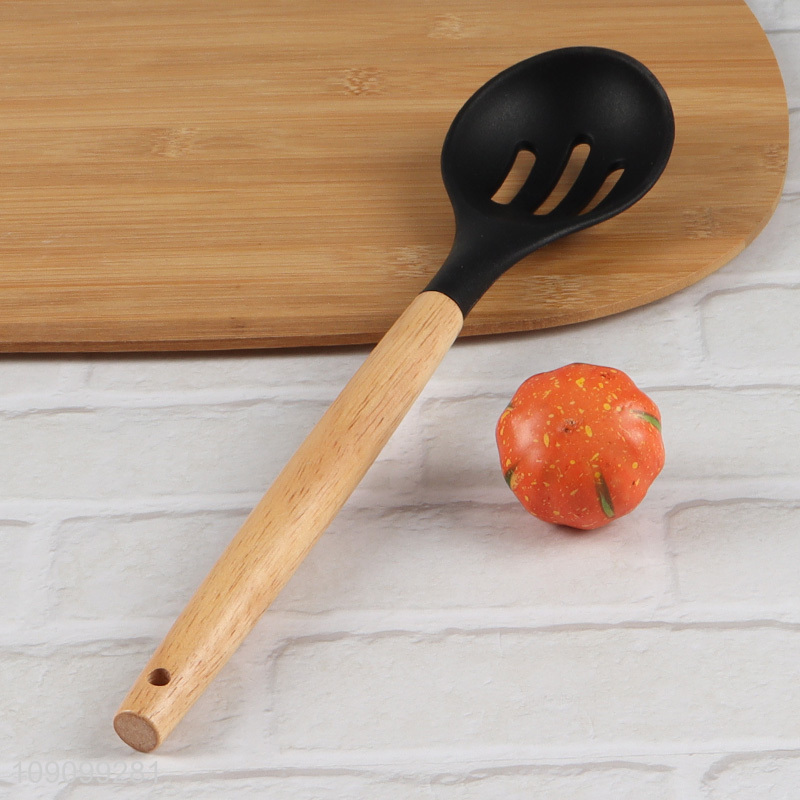 Low price kitchen utensil black slotted ladle with wooden handle